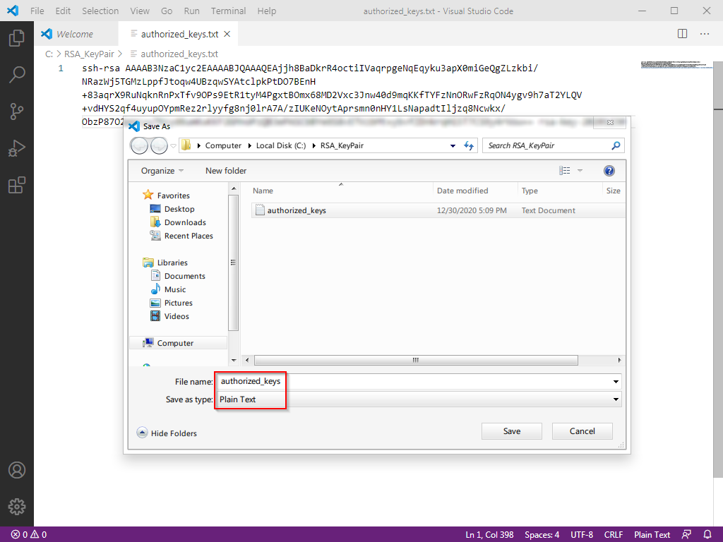 最重要的,将上方红框内的内容,向下滚动全部复制出来并保存,文件名为 authorized_keys。(用 vscode 保存,默认会变成带txt后缀的文本文件,这没关系,之后上传 VPS 时我们会把后缀名去掉)
